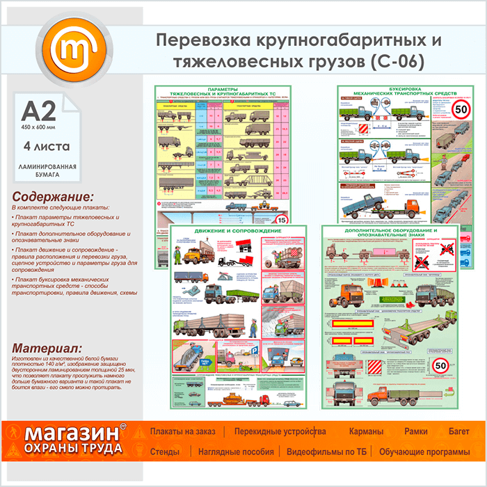 Плакаты «Перевозка крупногабаритных и тяжеловесных грузов» (С-06, ламинированная бумага, А2, 4 листа) в Кашире купить