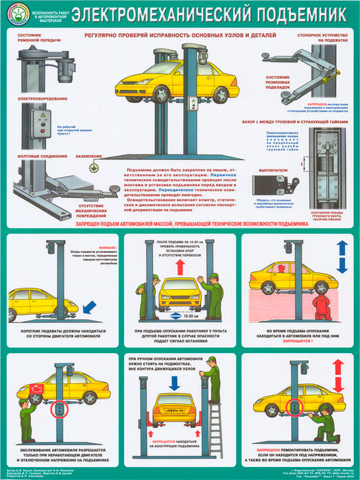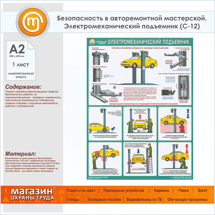 Плакат «Безопасность в авторемонтной мастерской. Электромеханический подъемник» (С-12, ламинированная бумага, А2, 1 лист) в Кашире купить