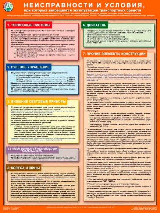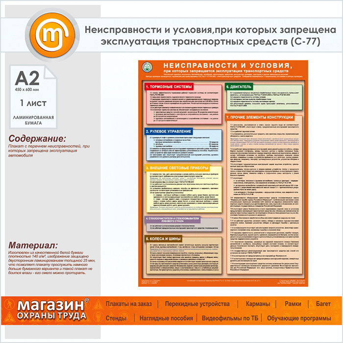 Плакат «Неисправности и условия, при которых запрещена эксплуатация транспортных средств» (С-77, ламинированная бумага, А2, 1 лист) в Кашире купить