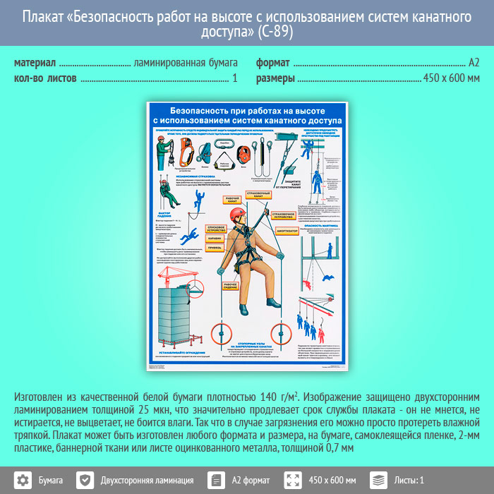 Плакат «Безопасность работ на высоте с использованием систем канатного доступа» (С-89, ламинированная бумага, А2, 1 лист) в Кашире купить