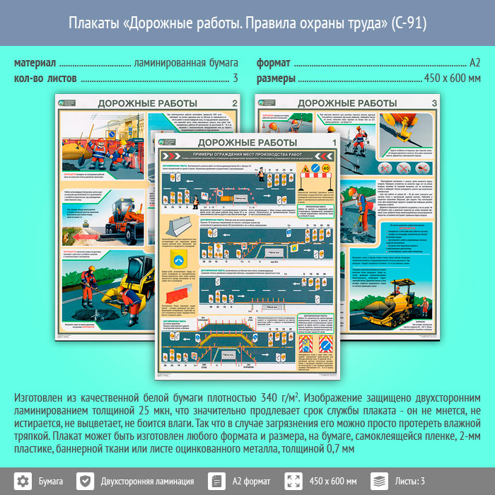 Плакаты «Дорожные работы. Правила охраны труда» (С-91, ламинированная бумага, А2, 3 листа) в Кашире купить