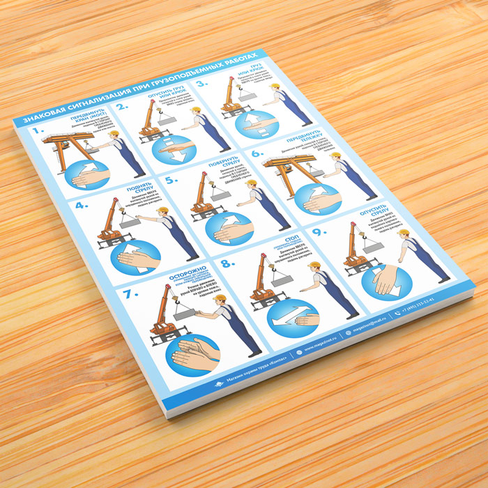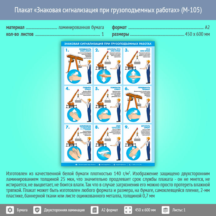 Плакат «Знаковая сигнализация при грузоподъемных работах» (М-105, ламинированная бумага, А2, 1 лист) в Кашире купить