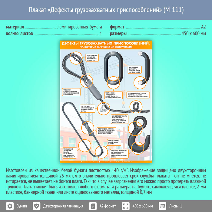 Плакат «Дефекты грузозахватных приспособлений» (М-111, ламинированная бумага, А2, 1 лист) в Кашире купить