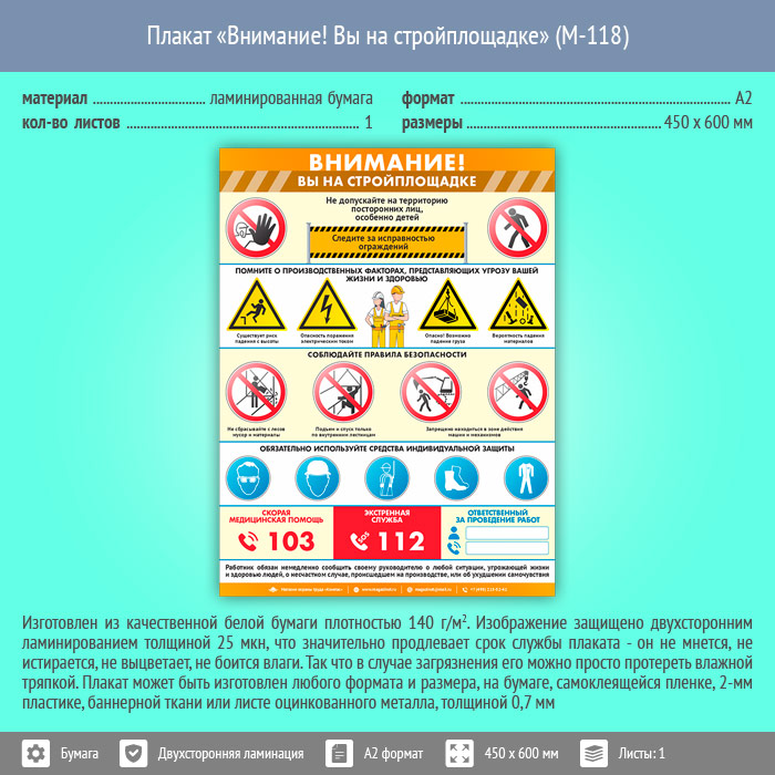 Плакат «Внимание! Вы на стройплощадке» (М-118, ламинированная бумага, А2, 1 лист) в Кашире купить