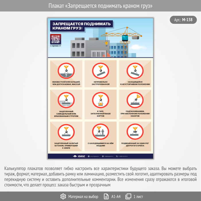 Плакат «Запрещается поднимать краном груз» с QR (М-138, 1 лист) в Кашире купить