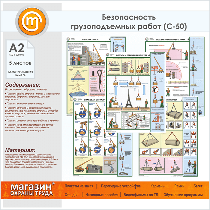 Плакаты «Безопасность грузоподъемных работ» (С-50, ламинированная бумага, А2, 5 листов) в Кашире купить