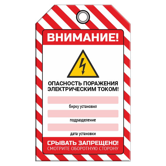 Бирка «ОПАСНОСТЬ ПОРАЖЕНИЯ ТОКОМ» (1 шт., двусторонняя, пластик, 70х115 мм) в Кашире купить