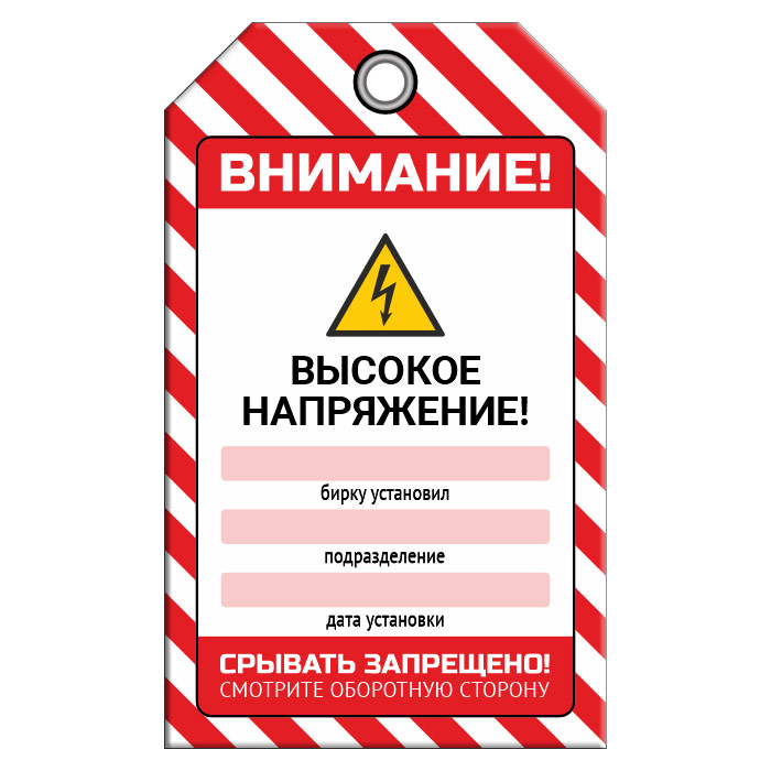 Бирки по электробезопасности изготавливаются из пластика 0,3 мм с полноцветной двусторонней печатью. Размер бирок - 70х115 мм. Для дополнительной защиты от факторов окружающей среды возможно ламинирование поверхности