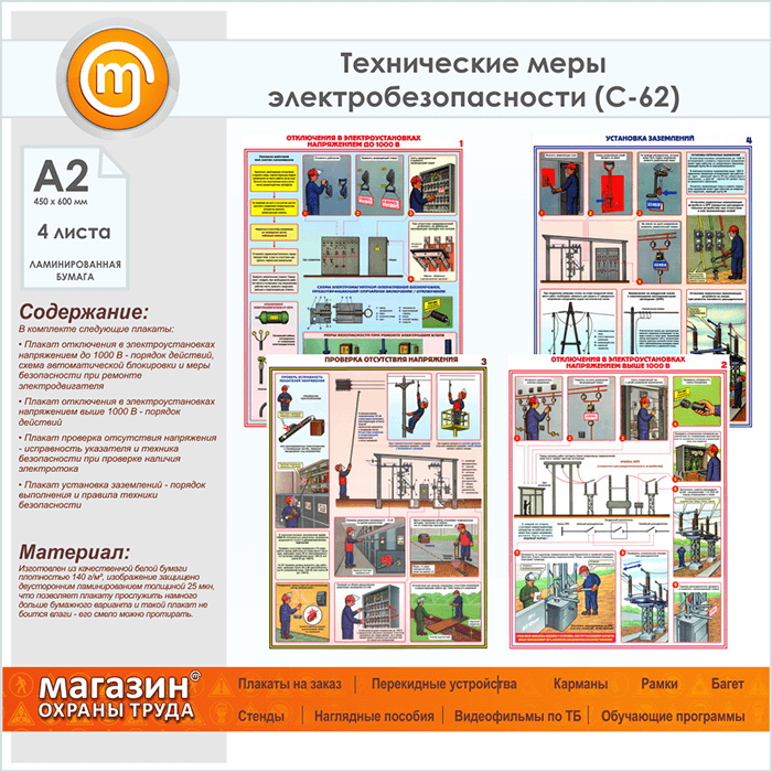 Плакаты «Технические меры электробезопасности» (С-62, ламинированная бумага, А2, 4 листа) в Кашире купить
