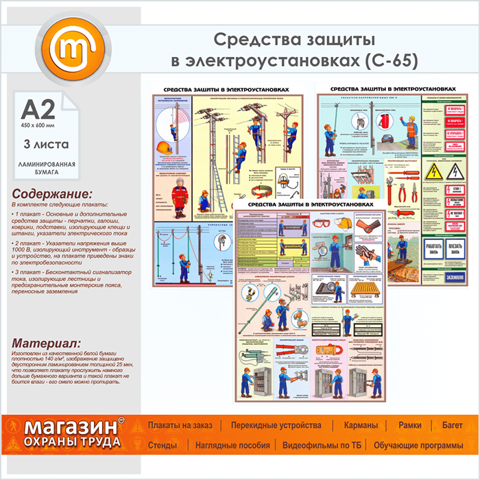 Плакаты «Средства защиты в электроустановках» (С-65, ламинированная бумага, А2, 3 листа) в Кашире купить