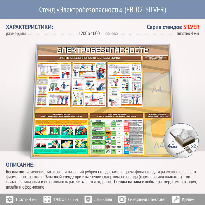 Стенд «Электробезопасность до 1000 вольт» с плоским и объемным карманами (EB-02-SILVER) в Кашире купить