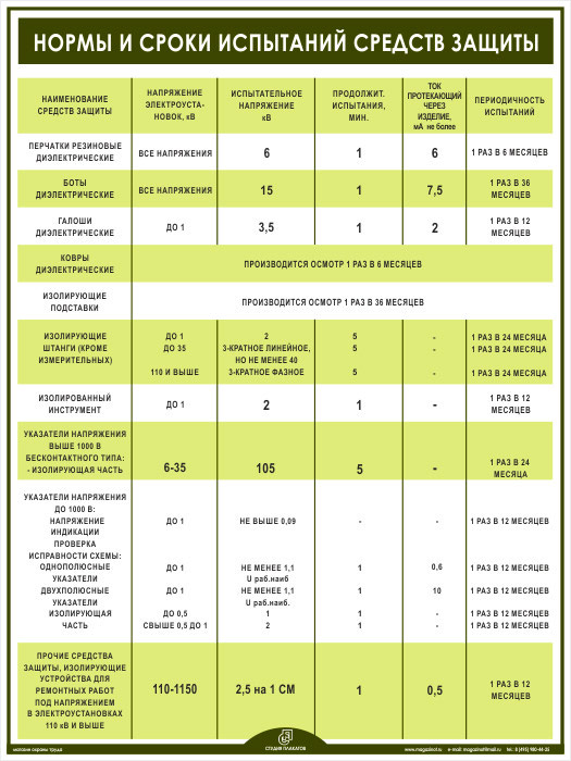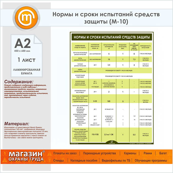 Плакат «Нормы и сроки испытаний средств защиты» (М-10, ламинированная бумага, А2, 1 лист) в Кашире купить
