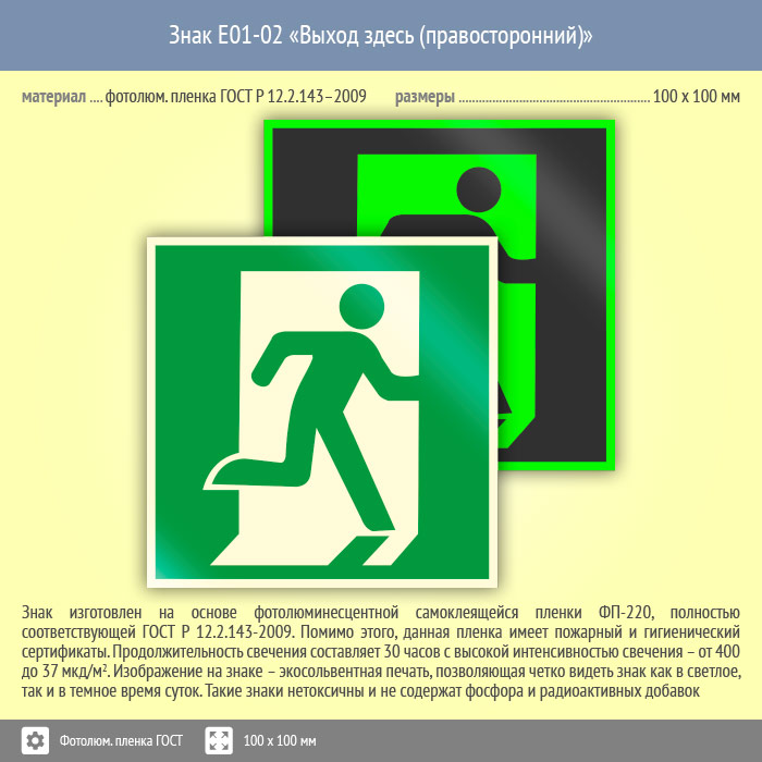 Знак E01-02 «Выход здесь (правосторонний)» (фотолюминесцентная пленка ГОСТ 34428-2018, 100х100 мм) в Кашире купить