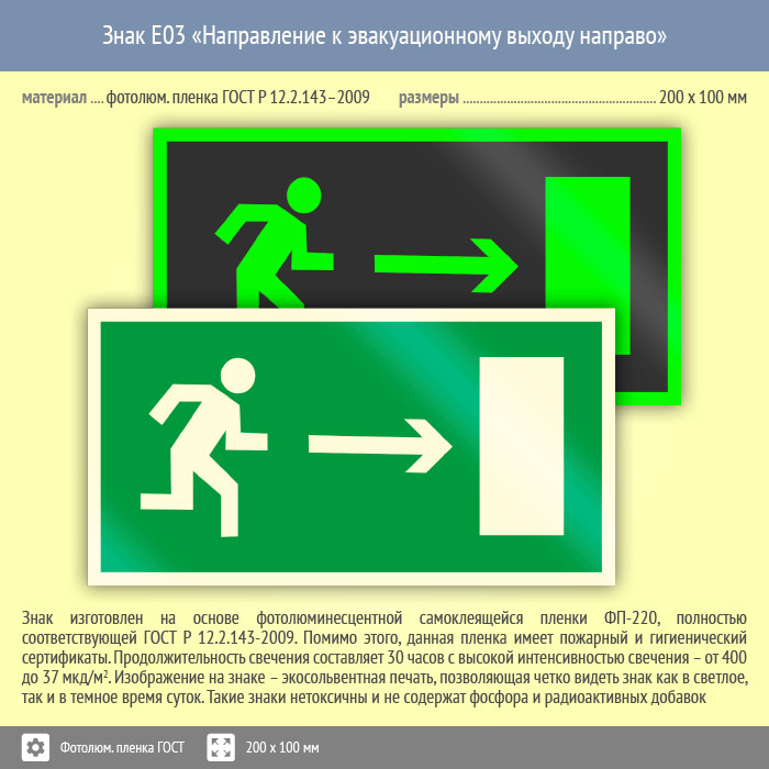 Знак E03 «Направление к эвакуационному выходу направо» (фотолюминесцентная пленка ГОСТ 34428-2018, 200х100 мм) в Кашире купить