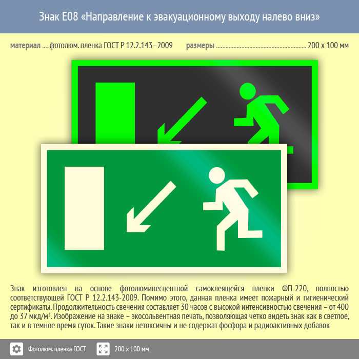 Знак E08 «Направление к эвакуационному выходу налево вниз» (фотолюминесцентная пленка ГОСТ 34428-2018, 200х100 мм) в Кашире купить