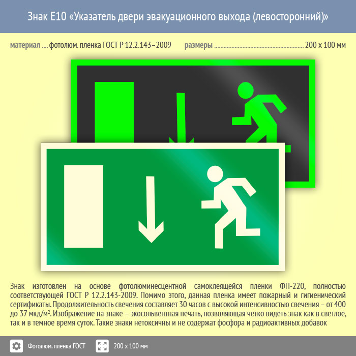 Знак E10 «Указатель двери эвакуационного выхода (левосторонний)» (фотолюминесцентная пленка ГОСТ 34428-2018, 200х100 мм) в Кашире купить