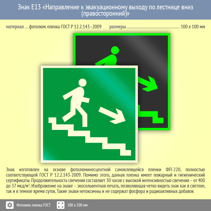 Знак E13 «Направление к эвакуационному выходу по лестнице вниз (правосторонний)» (фотолюминесцентная пленка ГОСТ 34428-2018, 100х100 мм) в Кашире купить