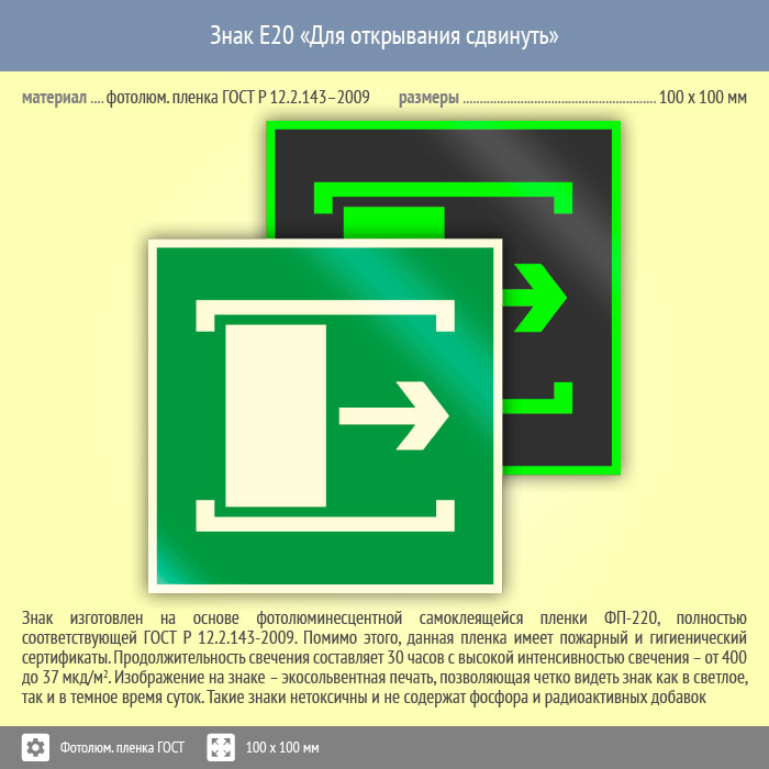 Знак E20 «Для открывания сдвинуть» (фотолюминесцентная пленка ГОСТ 34428-2018, 100х100 мм) в Кашире купить