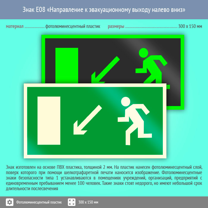 Знак E08 «Направление к эвакуационному выходу налево вниз» (фотолюминесцентный пластик, 300х150 мм) в Кашире купить