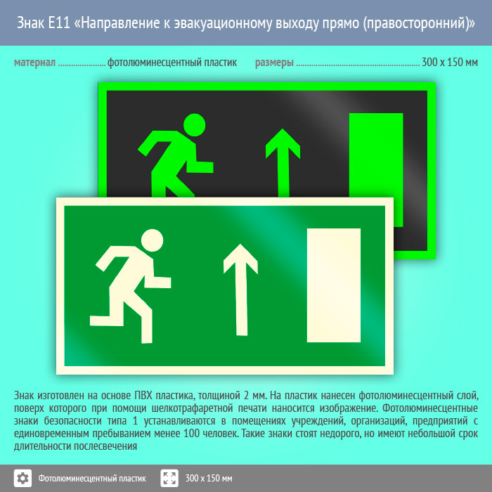 Знак E11 «Направление к эвакуационному выходу прямо (правосторонний)» (фотолюминесцентный пластик, 300х150 мм) в Кашире купить