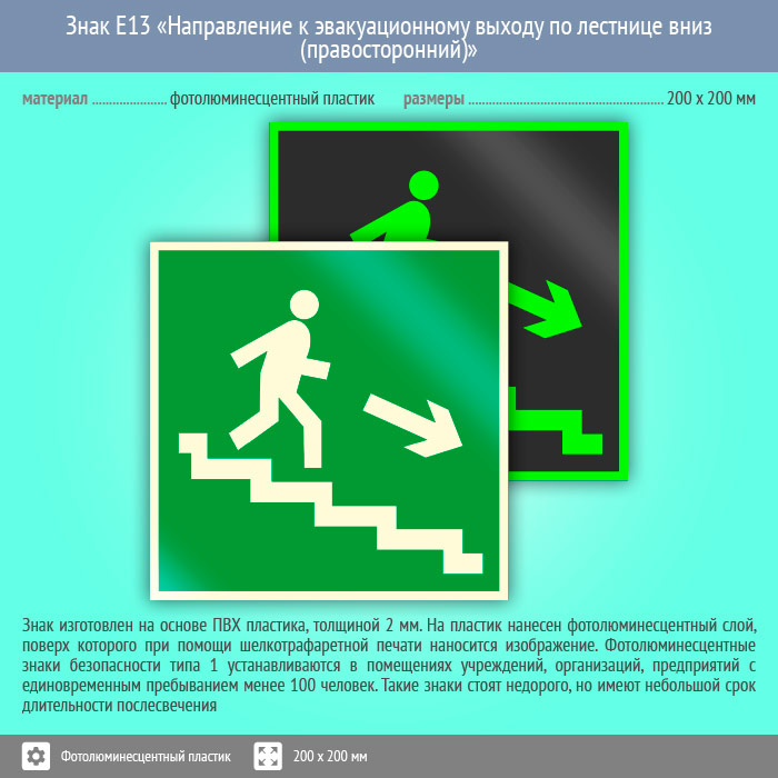 Знак E13 «Направление к эвакуационному выходу по лестнице вниз (правосторонний)» (фотолюминесцентный пластик, 200х200 мм) в Кашире купить
