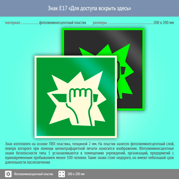Знак E17 «Для доступа вскрыть здесь» (фотолюминесцентный пластик, 200х200 мм) в Кашире купить