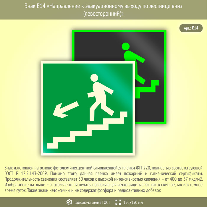 Знак E14 «Направление к эвакуационному выходу по лестнице вниз (левосторонний)» (фотолюминесцентная пленка ГОСТ 34428-2018, 150х150 мм) в Кашире купить