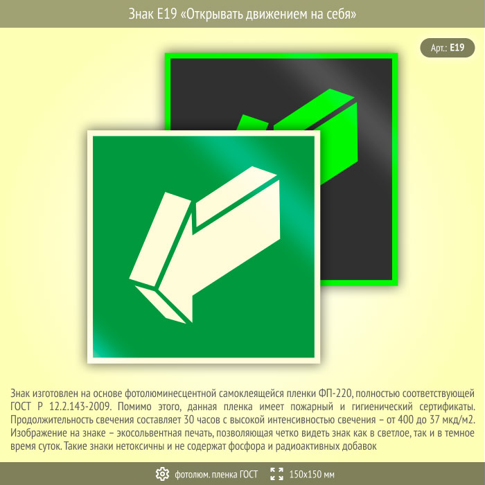 Знак E19 «Открывать движением на себя» (фотолюминесцентная пленка ГОСТ 34428-2018, 150х150 мм) в Кашире купить