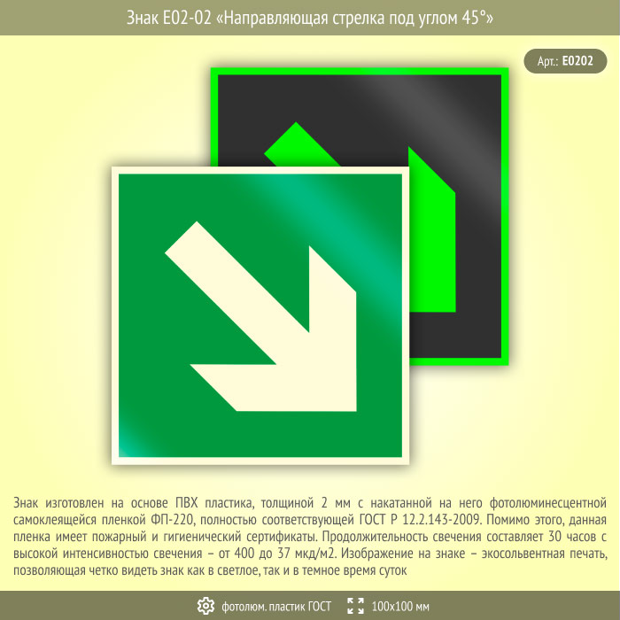 Знак E02-02 «Направляющая стрелка под углом 45°» (фотолюминесцентный пластик ГОСТ 34428-2018, 100х100 мм) в Кашире купить