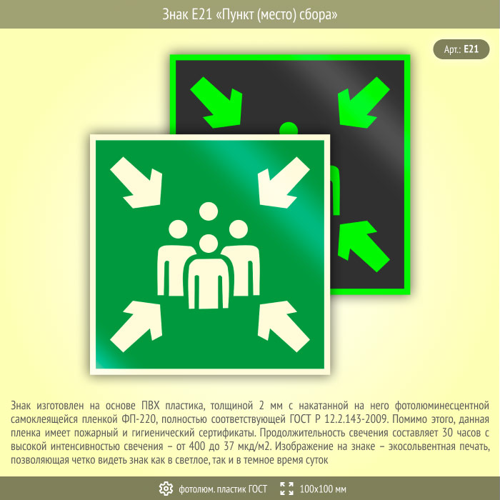 Знак E21 «Пункт (место) сбора» (фотолюминесцентный пластик ГОСТ 34428-2018, 100х100 мм) в Кашире купить