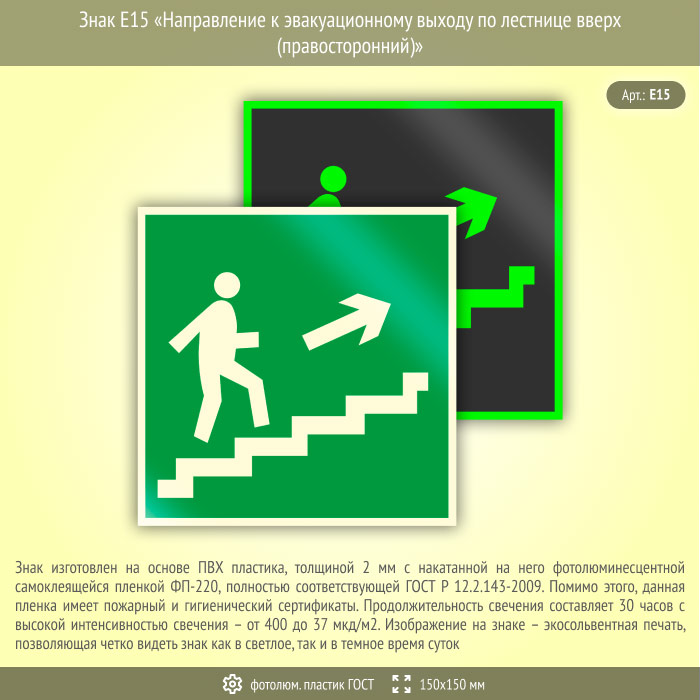 Знак E15 «Направление к эвакуационному выходу по лестнице вверх (правосторонний)» (фотолюминесцентный пластик ГОСТ 34428-2018, 150х150 мм) в Кашире купить