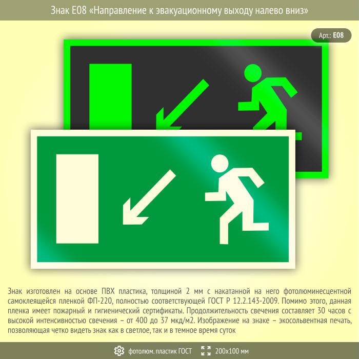 Знак E08 «Направление к эвакуационному выходу налево вниз» (фотолюминесцентный пластик ГОСТ 34428-2018, 200х100 мм) в Кашире купить