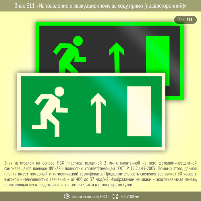 Знак E11 «Направление к эвакуационному выходу прямо (правосторонний)» (фотолюминесцентный пластик ГОСТ 34428-2018, 200х100 мм) в Кашире купить