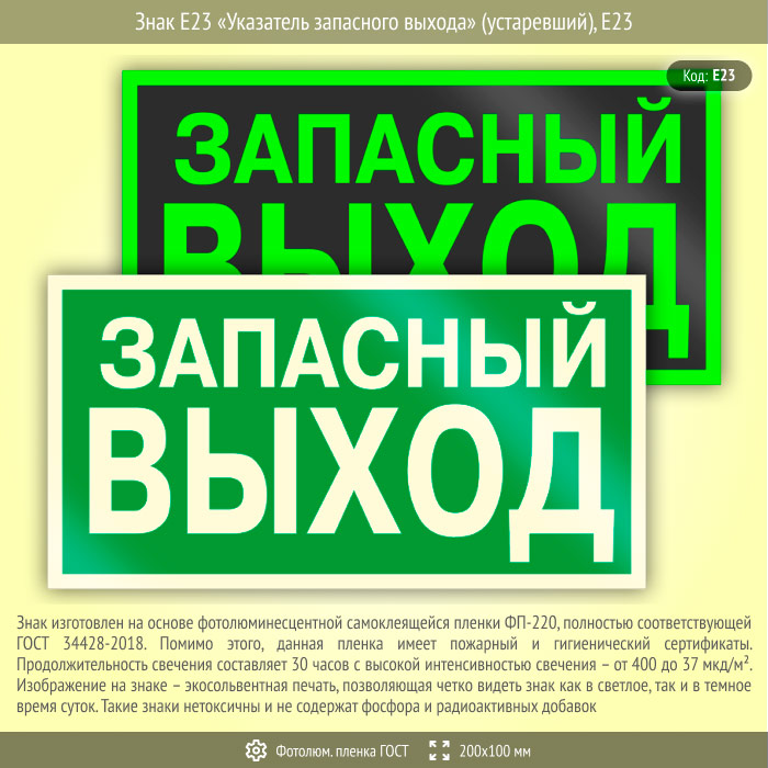 Знак E23 «Указатель запасного выхода» (устаревший) (фотолюминесцентная пленка ГОСТ 34428-2018, 200х100 мм) в Кашире купить