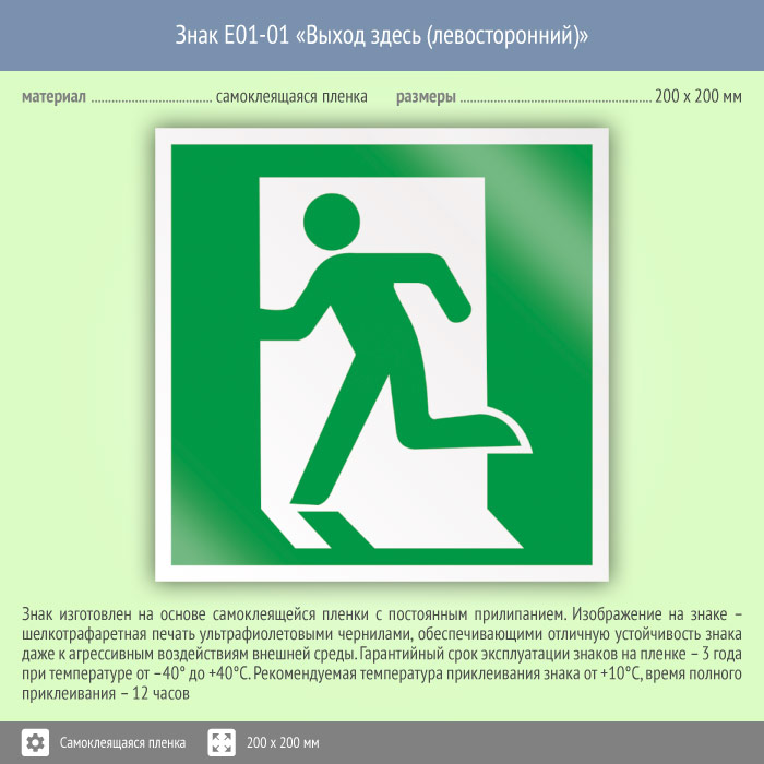 Знак E01-01 «Выход здесь (левосторонний)» (пленка, 200х200 мм) в Кашире купить