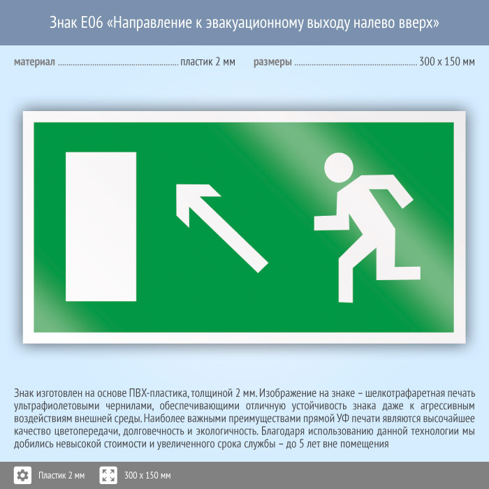 Знак E06 «Направление к эвакуационному выходу налево вверх» (пластик, 300х150 мм) в Кашире купить