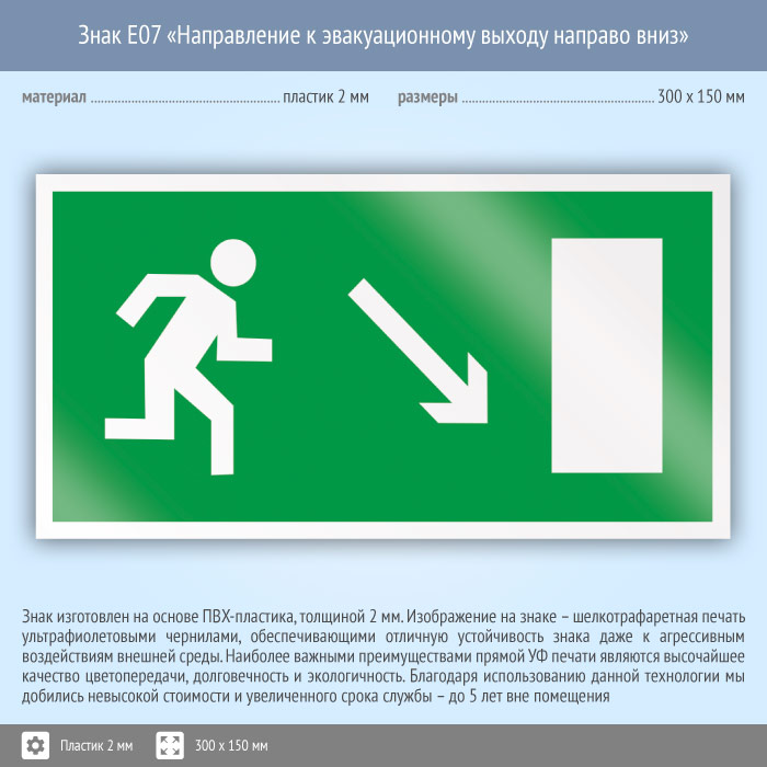 Знак E07 «Направление к эвакуационному выходу направо вниз» (пластик, 300х150 мм) в Кашире купить