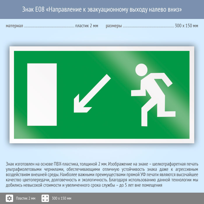 Знак E08 «Направление к эвакуационному выходу налево вниз» (пластик, 300х150 мм) в Кашире купить