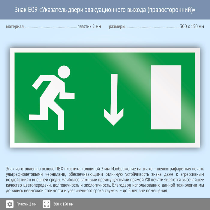 Знак E09 «Указатель двери эвакуационного выхода (правосторонний)» (пластик, 300х150 мм) в Кашире купить