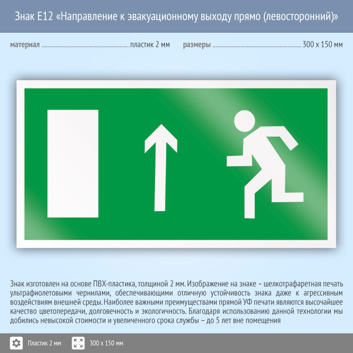 Знак E12 «Направление к эвакуационному выходу прямо (левосторонний)» (пластик, 300х150 мм) в Кашире купить
