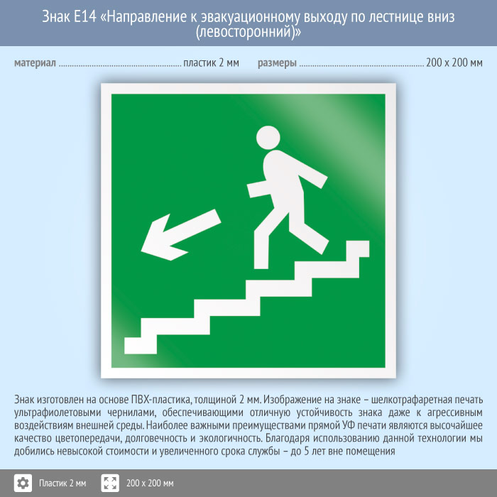 Знак E14 «Направление к эвакуационному выходу по лестнице вниз (левосторонний)» (пластик, 200х200 мм) в Кашире купить