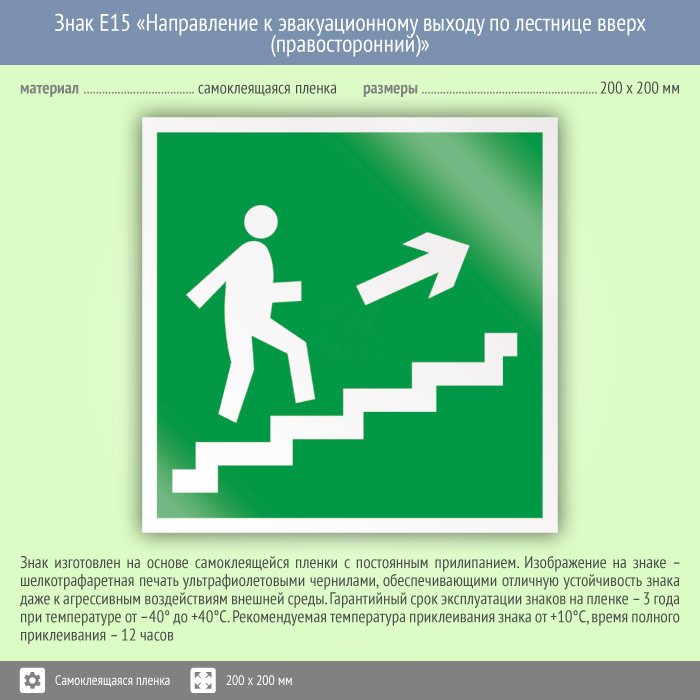 Знак E15 «Направление к эвакуационному выходу по лестнице вверх (правосторонний)» (пленка, 200х200 мм) в Кашире купить