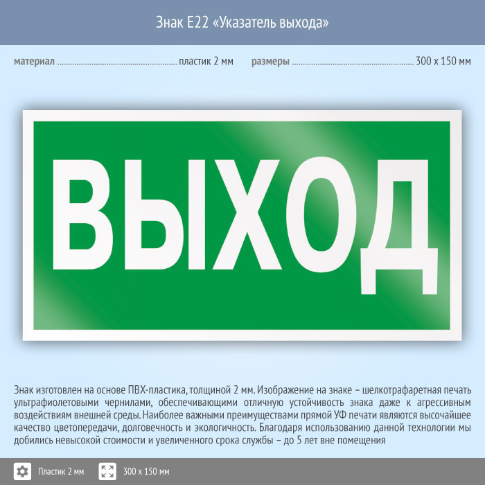 Знак E22 «Указатель выхода» (пластик, 300х150 мм) в Кашире купить
