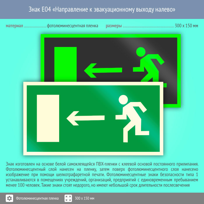 Знак E04 «Направление к эвакуационному выходу налево» (фотолюминесцентная пленка, 300х150 мм) в Кашире купить