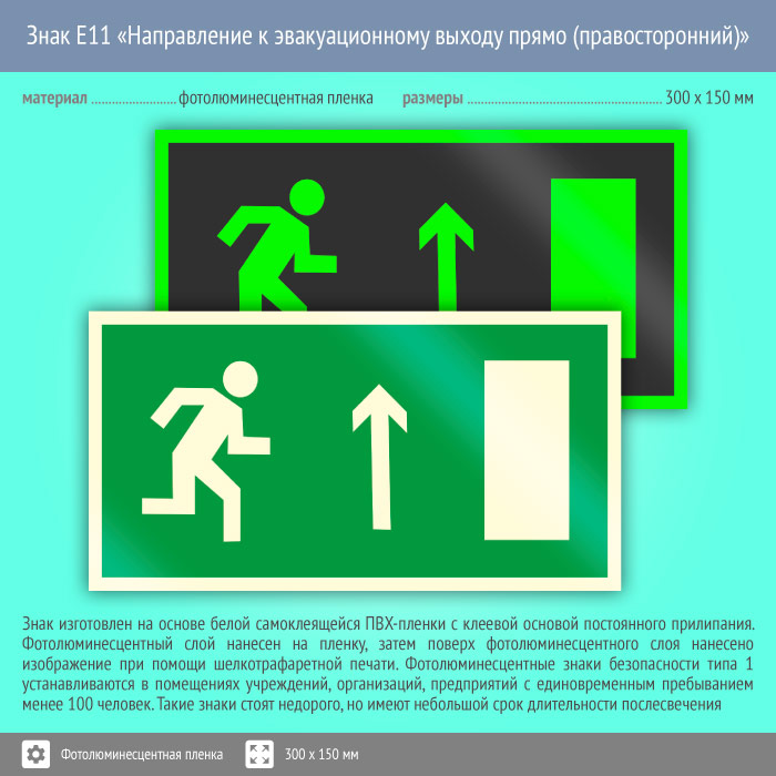 Знак E11 «Направление к эвакуационному выходу прямо (правосторонний)» (фотолюминесцентная пленка, 300х150 мм) в Кашире купить