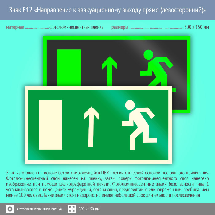 Знак E12 «Направление к эвакуационному выходу прямо (левосторонний)» (фотолюминесцентная пленка, 300х150 мм) в Кашире купить