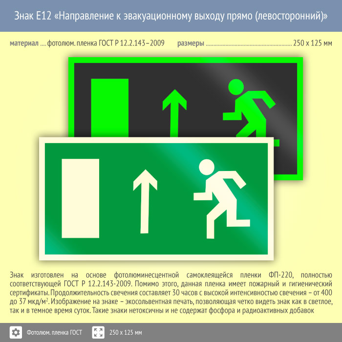 Знак E12 «Направление к эвакуационному выходу прямо (левосторонний)» (фотолюминесцентная пленка ГОСТ 34428-2018, 250х125 мм) в Кашире купить