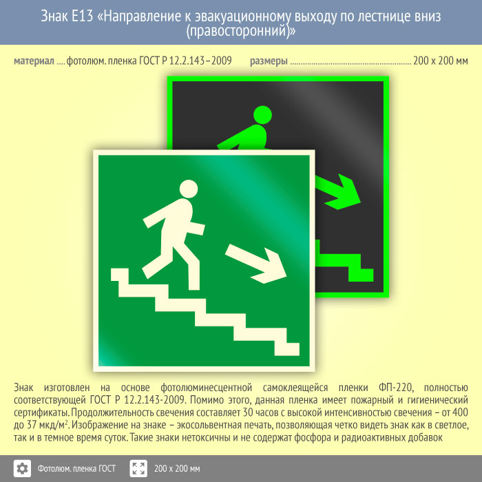Знак E13 «Направление к эвакуационному выходу по лестнице вниз (правосторонний)» (фотолюминесцентная пленка ГОСТ 34428-2018, 200х200 мм) в Кашире купить