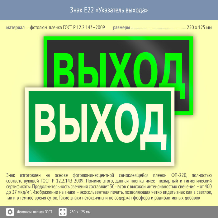 Знак E22 «Указатель выхода» (фотолюминесцентная пленка ГОСТ 34428-2018, 250х125 мм) в Кашире купить