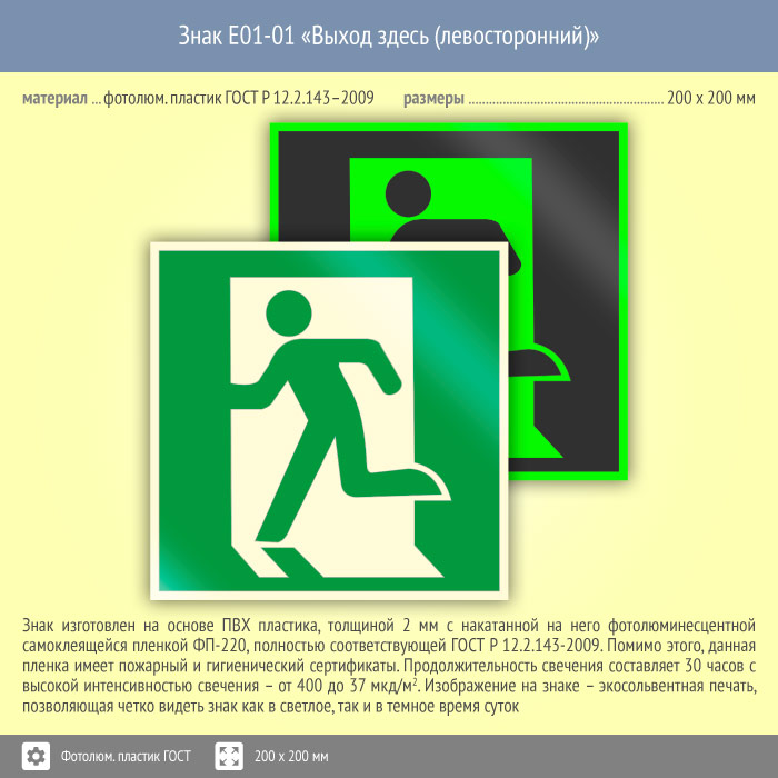 Знак E01-01 «Выход здесь (левосторонний)» (фотолюминесцентный пластик ГОСТ 34428-2018, 200х200 мм) в Кашире купить